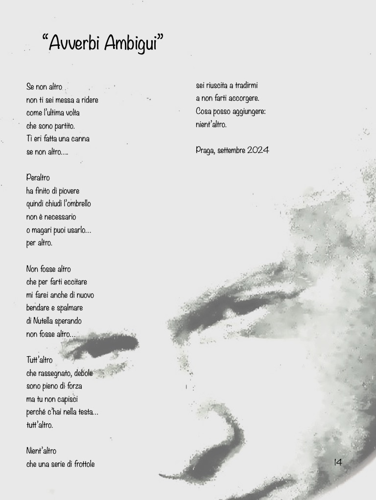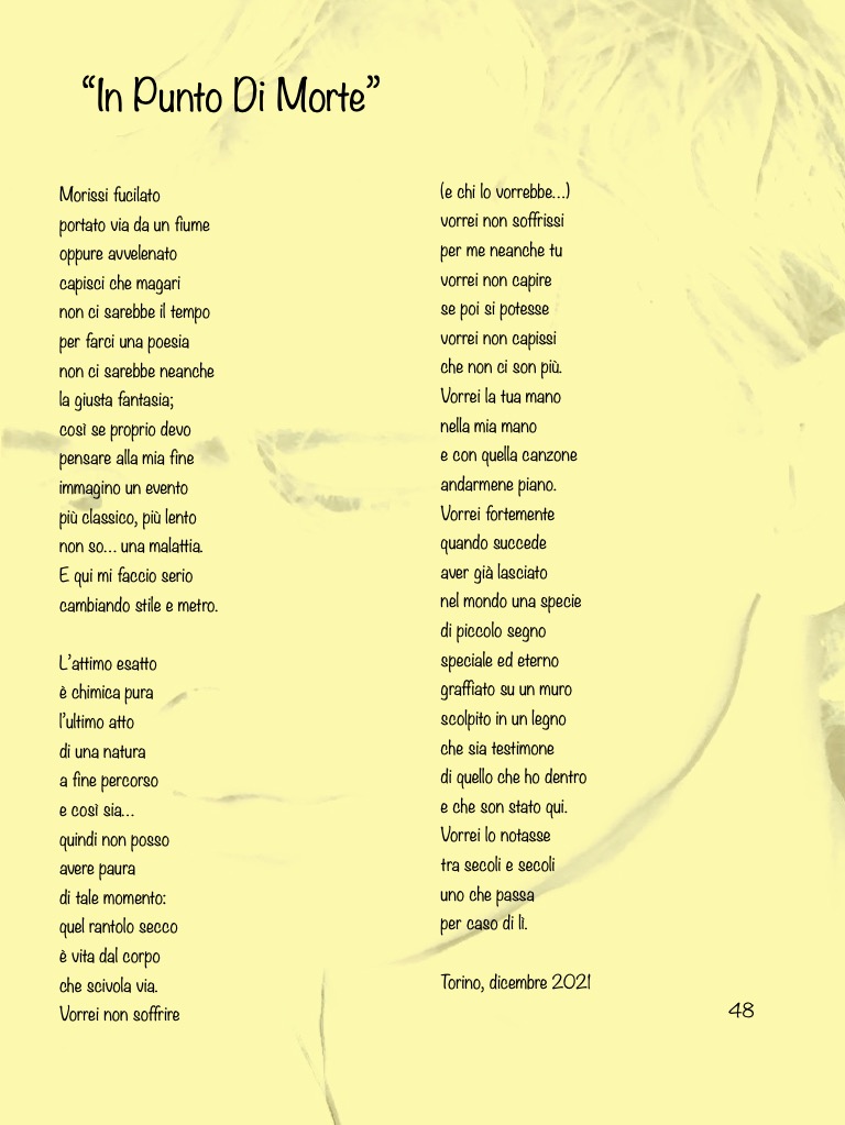 Singing can be said to be my job and writing songs is probably the artistic practice that best suits me but poetry has always been my true secret love, since adolescence …Ironic and other more introspective compositions, aphorisms, sonnets and small thoughts finally collected, after twenty years, in an editorial work that almost sums up my life up to now. I have tried to convey in the poem the innate sensitivity and rhythmic sense that are typical of my songs. My style, my rhymes or my assonances, while well-groomed, tend to favor the communicative intent over delusions of metric and literary scholastic finiteness. I hate the purists of literary school but when I re-read my works, the emotional transport and the fluidity of the verses are my priorities to qualify it; eliciting a smile, a tear, a grimace from the reader is the goal and not to amaze academics with artifices and redundancies. On this page you will find only a few “pills of poetry” which are not part of the book which you can download online (more info in the News section). I’m curious to know what you think about it …